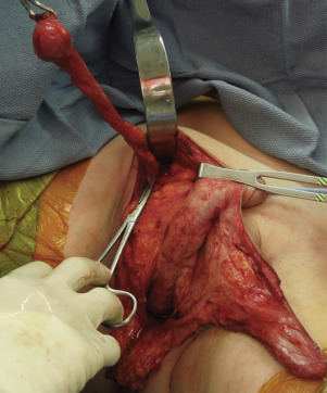 Following elevation of both the penile and the scrotoperineal flaps, access to the testicles and spermatic cords is established, allowing the performance of bilateral orchiectomies. The orchiectomies, including resection of the spermatic cords, are carried out at the level of the external inguinal ring ( Figs. 5.11 and 5.12 ). Resection of the spermatic cord at this level allows the spermatic cord to retract within the inguinal canal and prevents a palpable bulge in the groin area. The skin of the penile shaft is then circumferentially incised at the junction of the glans and penile shaft, facilitating elevation of the penile flap ( Fig. 5.13 ). This facilitates separation of the penile skin from the underlying corpora cavernosa and corpora spongiosum, as well as the underlying muscles, the ischiocavernosus and bulbospongiosus muscles, respectively ( Fig. 5.14 ).