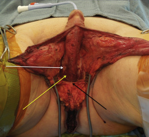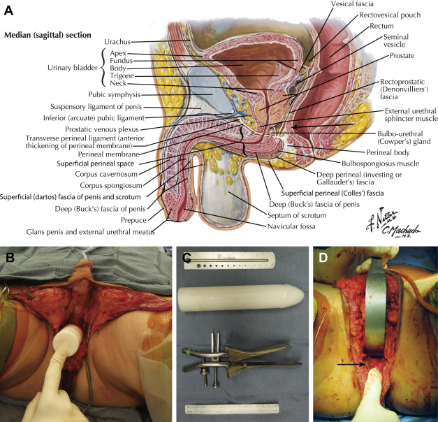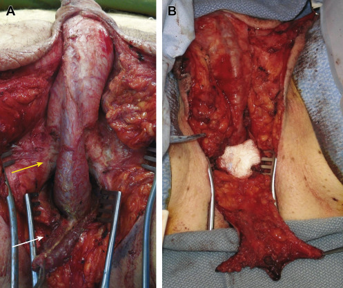 The vaginal cavity is developed by dissection between the prostate and rectum ( Fig. 5.15 ). During this dissection, injury to the rectum may occur. Dissection follows Denonvilliers fascia until the peritoneal reflection is reached. Most of the dissection is performed bluntly; however, release of the attachments between the prostate and rectum may require sharp division. The levator ani muscles are incised with electrocautery to allow further lateral expansion of the neovaginal cavity ( Fig. 5.16 ). Adequate dissection of the neovaginal space is essential in creating and maintaining adequate vaginal depth and width. Once the vaginal cavity is created, the superficial perineal muscles are resected. Resection of the bulbospongiosus and ischiocavernosus muscles aids with expansion of the introitus and exposure of the underlying corpora spongiosum and corpora cavernosa ( Fig. 5.17 ). At this point, the corpora spongiosum is separated from the corpora cavernosa ( Fig. 5.18 ). In order to further open the vaginal cavity, the corpora spongiosum is resected and oversewn at the level of the urethral bulb ( Fig. 5.19 ). If excess erectile tissue is not removed, this tissue may become engorged during sexual arousal and restrict entry into the vaginal cavity.