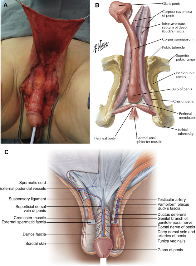 Surgical conversion of the genitalia in transwomen has evolved since the use of skin grafts for creation of a neovagina in cases of vaginal agenesis. The use of pedicled penile and scrotal flaps was described over 40 years ago, and despite technical refinements, remains the mainstay for neovaginal construction. The vascular basis of these flaps is derived from 1 of 2 sources: (1) the femoral artery (deep and superficial external pudendal arteries) and (2) the internal pudendal artery (perineal branches, branches to the bulb and urethra of the penis, and the deep and dorsal penile branches) ( Fig. 5.1 ).