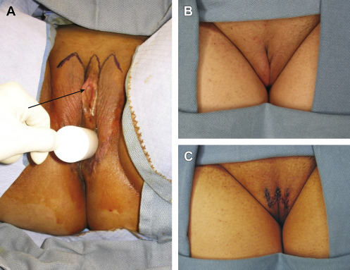 Although a functional vaginoplasty is performed in a single stage, further feminization of the mons pubis can be performed at a second surgical stage. The labiaplasty, which can be performed under local anesthesia as an outpatient procedure 3 months after vaginoplasty, creates a convergent anterior labial commissure and provides additional clitoral hooding. However, with recent trends toward hair removal of the mons pubis, fewer individuals opt to proceed with secondary labiaplasty ( Fig. 5.2 ).