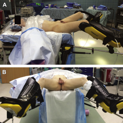 Regardless of the technique used, hormones are discontinued approximately 2 weeks before surgery to reduce the risk of venous thromboembolism, and a preoperative bowel preparation is administered ( Box 5.2 ). Before surgery, sequential compression devices (SCD) are placed, and intravenous antibiotics are administered. Following induction of general anesthesia, chemoprophylaxis for venous thromboembolism is administered subcutaneously (either fractionated or unfractionated heparin depending on institutional policies); the patient is positioned in lithotomy position; bony prominences are padded; the arms are abducted on foam rests with flexion at the elbows; an upper body forced-air surgical warming blanket is placed; and an indwelling urinary catheter is inserted under sterile conditions after the patient is prepared and draped ( Fig. 5.4 ). The patient’s position may vary when an intestinal vaginoplasty is performed robotically.