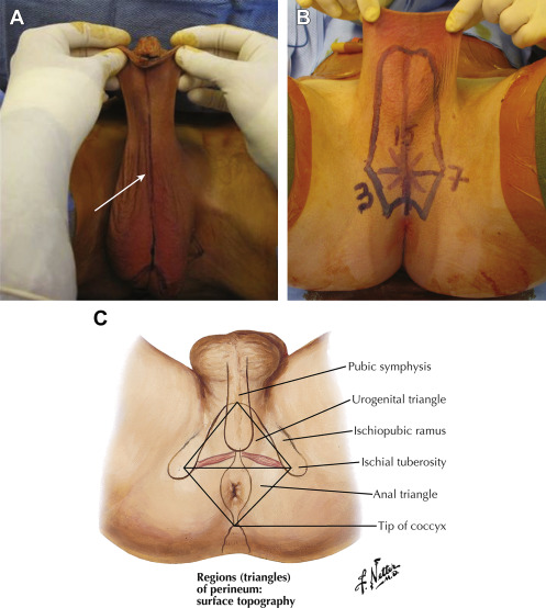 The procedure is begun with the creation of a posteriorly based scrotal-perineal flap. The dimensions of this flap may vary, depending on whether the scrotal-perineal flap forms the entire posterior vaginal wall or, alternatively, is inset into the penile flap. For individuals who are not circumcised, a smaller, limited scrotal-perineal flap is typically chosen. If used to form the entire posterior vaginal wall, the flap typically measures approximately 15 cm in length, has a base diameter of 3 to 4 cm, and is approximately 6 to 8 cm in the largest transverse dimension. The flap needs to be of sufficient width so as not to limit the vaginal introitus. However, the borders of the flap are maintained within the boundaries of the scrotum to create a smooth, graded, and contiguous appearance to the newly formed labia majora. In addition, the lateral aspect of the flap is designed in a “V-shaped” fashion so as not to create a circular introitus, thereby minimizing the chance of introital contracture. The flap is centered cephalad to the anus and elevated in an extrasphincteric plane, with care taken not to injure the external anal sphincter ( Fig. 5.8 ). The flap should be thin, and its base is elevated so as to maintain a broad subcutaneous pedicle without creating a rectangular appearance to the posterior labial commissure ( Fig. 5.9 ).