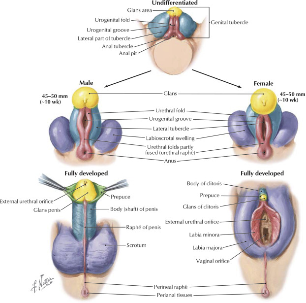 External genitalia have the potential to be either male or female and are termed “bipotential.” In order to develop male external genitalia, androgens are required. In both sexes, in about the fourth week of development, the genital tubercle elongates to form the phallus. In a developing male, androgens induce the fusion of the urethral folds to form the urethra. In addition, the genital tubercle enlarges to form the glans penis, and midline fusion of the genital swellings results in formation of the scrotum. In the female, the urethral folds and genital swellings remain separate and form the labia minora and majora. The genital tubercle forms the clitoris.