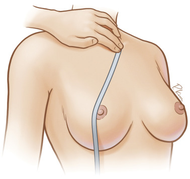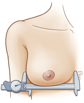 A careful examination and measurement of key landmarks on both breasts is critical, particularly breast base width, distance from nipple to inframammary fold, and distance from sternal notch to nipple ( Figs. 18.2–18.4 ). Any asymmetries must be noted, in both position and size of the NAC on both breasts. Furthermore, these measurements must be repeated on the reconstructed breast through the treatment, as the NAC position can change through mastectomy and reconstruction, and this must be accounted for when planning contralateral symmetry procedures.