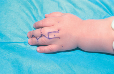The metacarpophalangeal joints are flexed to 90 degrees, and the metacarpal heads are marked on the dorsum of each digit to be released.