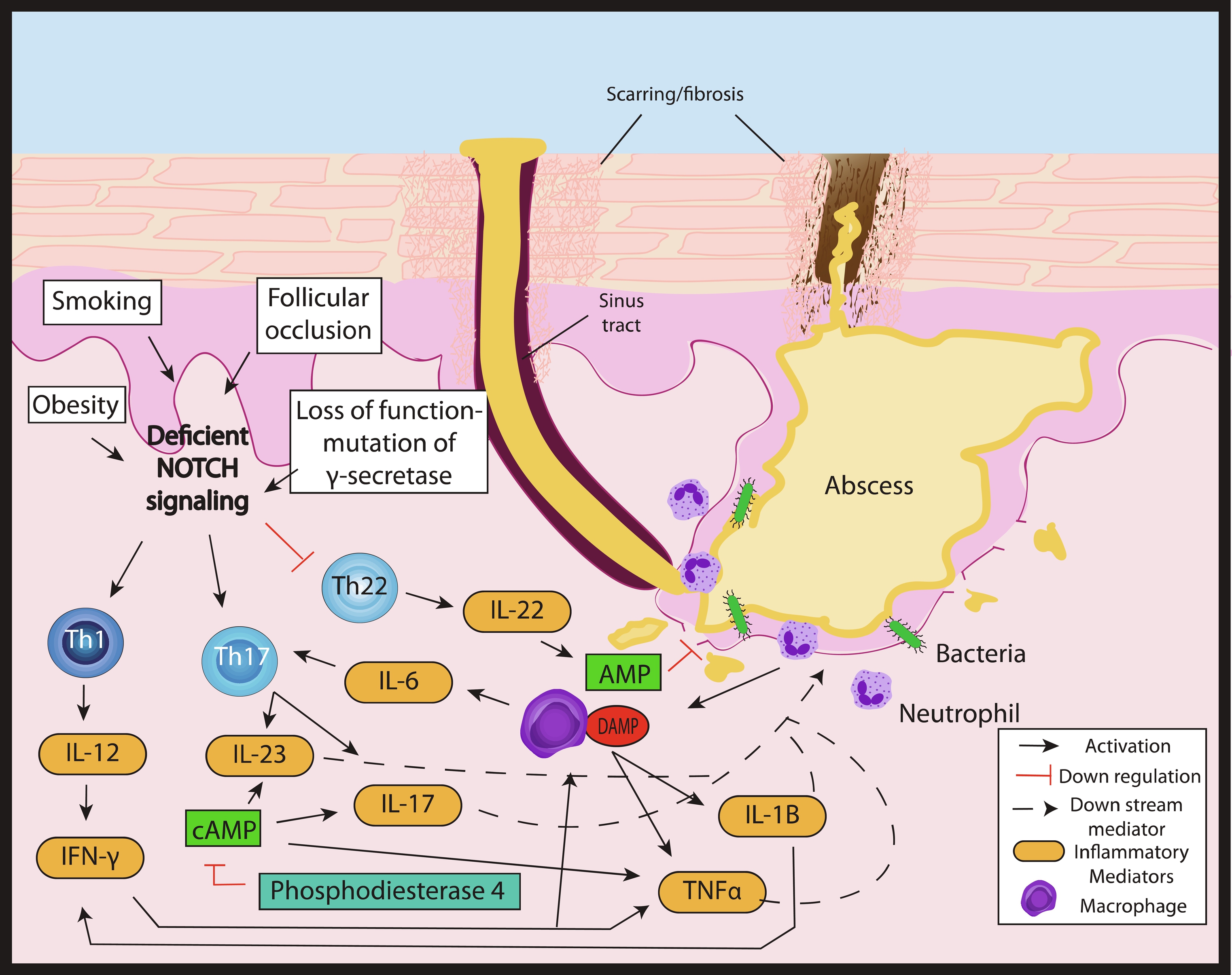 The efficacy of anti-TNF therapy in patients with HS, along with elevated serum TNF levels, have highlighted the role of this pathway in the pathophysiology of HS. However a significant number of patients with HS do not respond to anti-TNF therapy, suggesting the disease cannot be fully explained or controlled via a single inflammatory pathway alone. Research to date has demonstrated that Th17-associated cytokines are increased in HS, including IL-1, IL-17, and IL23. In kind, CD161, a marker of Th17 lineage T-cells, is significantly elevated in lesional skin (LS) and peri-lesional skin (PLS) in patients with HS, as compared to healthy controls. T-regulatory (Treg) cells are also elevated in HS, LS, and PLS; however, the ratio of Th17 to Treg cells is highly skewed in HS tissue toward Th17 cells, suggesting immune dysregulation plays a significant role in HS inflammation. IL-1β and TNF have themselves demonstrated differential concentrations in draining lesions, depending on the patient.
