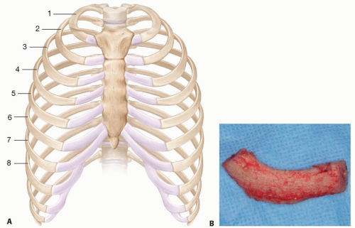 TECH FIG 1 • A. Chest wall showing rib anatomy. The 7th rib is longer and straighter than the 5th and 6th ribs. The 6th rib has a genu where the rib passes below the breast. B. Harvested rib.