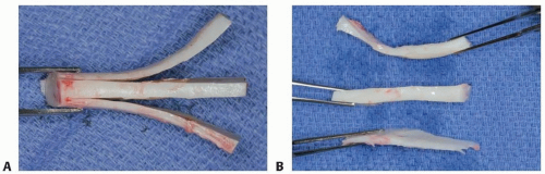 TECH FIG 2 • A. Younger patient with the rib being carved into three separate segments. Note the bending of the cartilage. B. For larger dorsal grafts, the central segment of the rib can be made thicker to allow for a thicker dorsal graft.