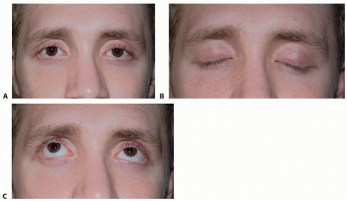 FIG 1 • This young patient presents with bilateral ptotic upper eyelids. A. He has empty upper sulci and an increased supratarsal fold distance. B,C. The upper eyelid excursion during the upper and lower gazes is 12 mm, and he has good levator function.
