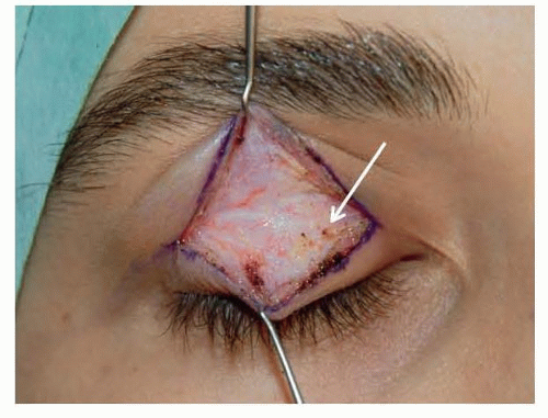 FIG 2 • Skin muscle flap elevated following upper blepharoplasty incision. There is a thin layer of adipose tissue medially and less laterally. This fatty layer is a landmark to be able to distinguish the upper orbital septum.