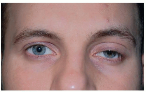 FIG 3 • This 28-year-old patient underwent two unsuccessful left ptosis repair attempts in the previous 2 years. The second surgery consisted of resection and shortening of the levator aponeurosis. The ptosis recurred a week after surgery. He has the typical symptoms of levator detachment with an increased supratarsal distance, upper eyelid ptosis, and slight elevation of the left eyebrow. The loss of the levator aponeurosis contribution to the lateral canthus resulted in relaxation of the lower eyelid on the left side causing a scleral show and distortion of the proper cant of the eye. Even the vertical orientation of the eyelashes is affected due to loss of the levator aponeurosis pull on the skin.