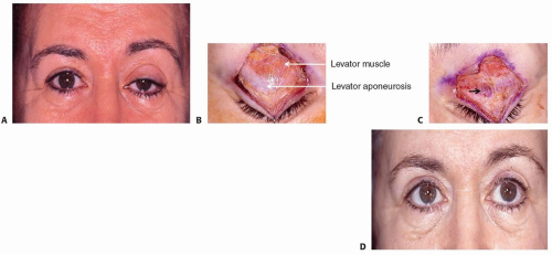 FIG 4 • A. A 64-year-old patient seen following a cyst removal from the left upper eyelid. She has left frontalis muscle hyperactivity due to left eyelid ptosis, an increased supratarsal distance. B. Intraoperative findings of the patient. The upper orbital septum is opened, and the preaponeurotic fat pad is retracted to expose the levator system. The right upper eyelid shows a normal anatomy of levator muscle and mechanism. C. The left upper eyelid levator aponeurosis has a significant injury medially, which possibly caused complete detachment of the system resulting in upper eyelid ptosis. D. One year after treatment with a levator advancement technique, she had bilateral blepharoplasty to equalize the supratarsal fold and correct the left ptosis. However, the frontalis muscle hyperactivity is not completely resolved.