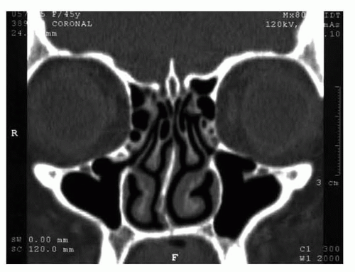 FIG 1 • Coronal CT image illustrating a deviated nasal septum and asymmetric turbinates. (Reprinted from Guyuron B. Correcting deviated noses, septoplasty, and turbinectomy. In: Rhinoplasty. Philadelphia, PA: Elsevier; 2012:306, with permission from Elsevier.)