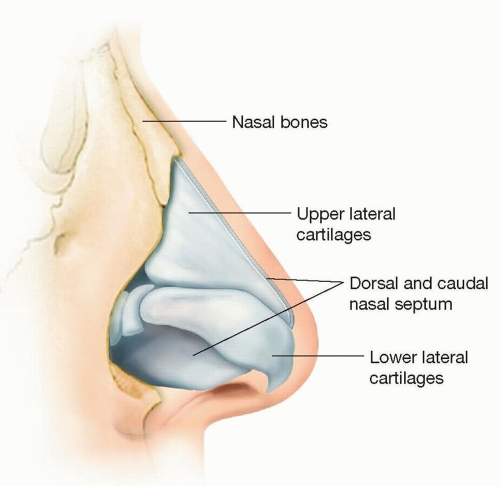Increased nasal length may result from multiple anatomic subsites including the radix and nasal bones, dorsal and caudal nasal septum, and/or excess paired nasal cartilages. These structures may be solely responsible for the long nose, but more often it is a combination of subsites (FIG 1).