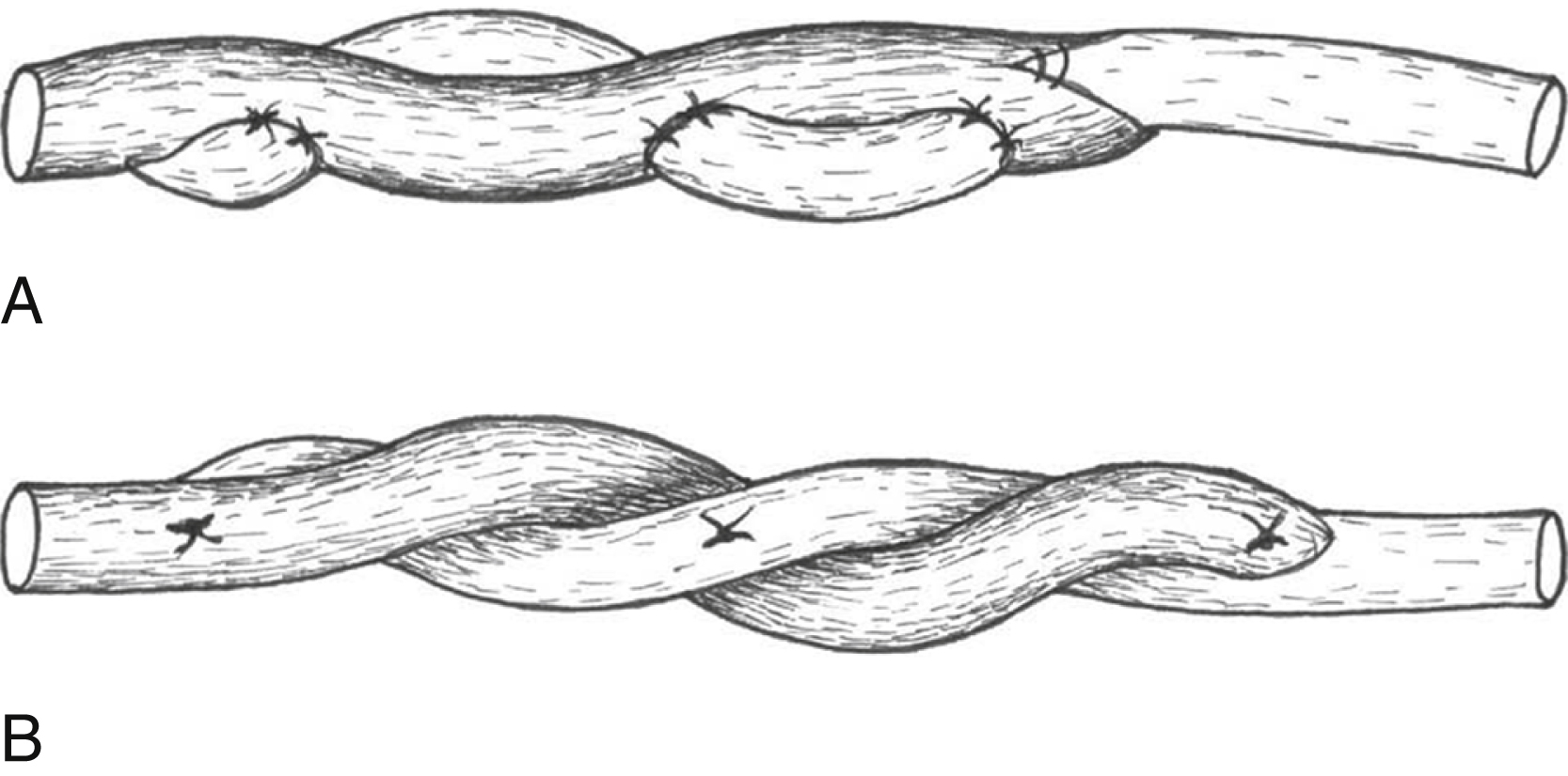 A number of different techniques have been developed for the coaptation of tendons. The Pulvertaft weave, Kessler grasping suture, and Mason/Nicoladoni side-to-side repair have all been used historically. Recently, newer alternatives have been developed, such as the lasso and spiral linking repairs, which demonstrate comparable strength and may be easier and quicker to perform. The senior author’s preference is to use the Pulvertaft weave ( Fig. 49.3 ).