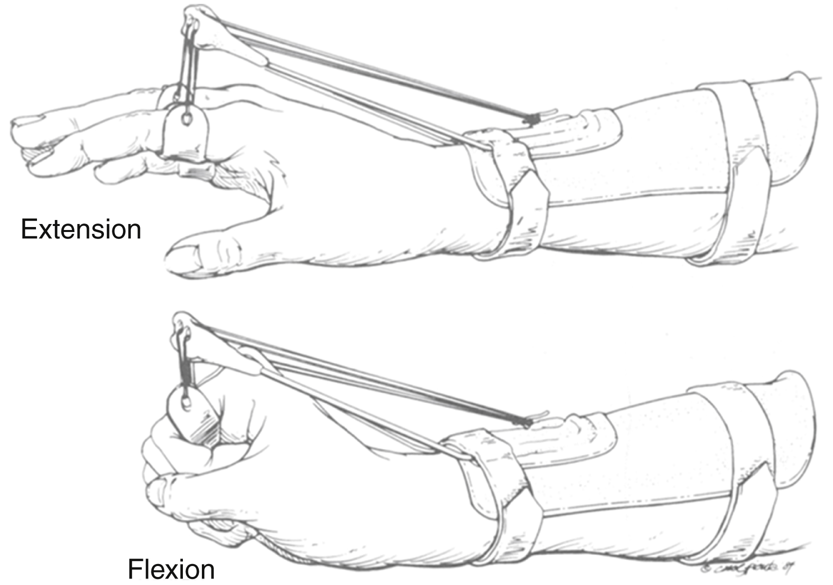 The key reconstructive aims are: wrist extension, metacarpophalangeal (MCP) joint extension, and thumb extension and abduction ( Table 49.4 ). These are generally performed in set combinations for ease of access and operative technique, with the main difference being the choice of MTU to be used for restoration of MCP joint extension. As discussed above (see Indications), some authors advocate using an early tendon transfer procedure to preserve function and prevent contractures in cases of radial nerve injury. Where this is not done, the use of a dynamic outrigger splint ( Fig. 49.4 ) results in greatly improved grip strength by fixing the wrist in extension.