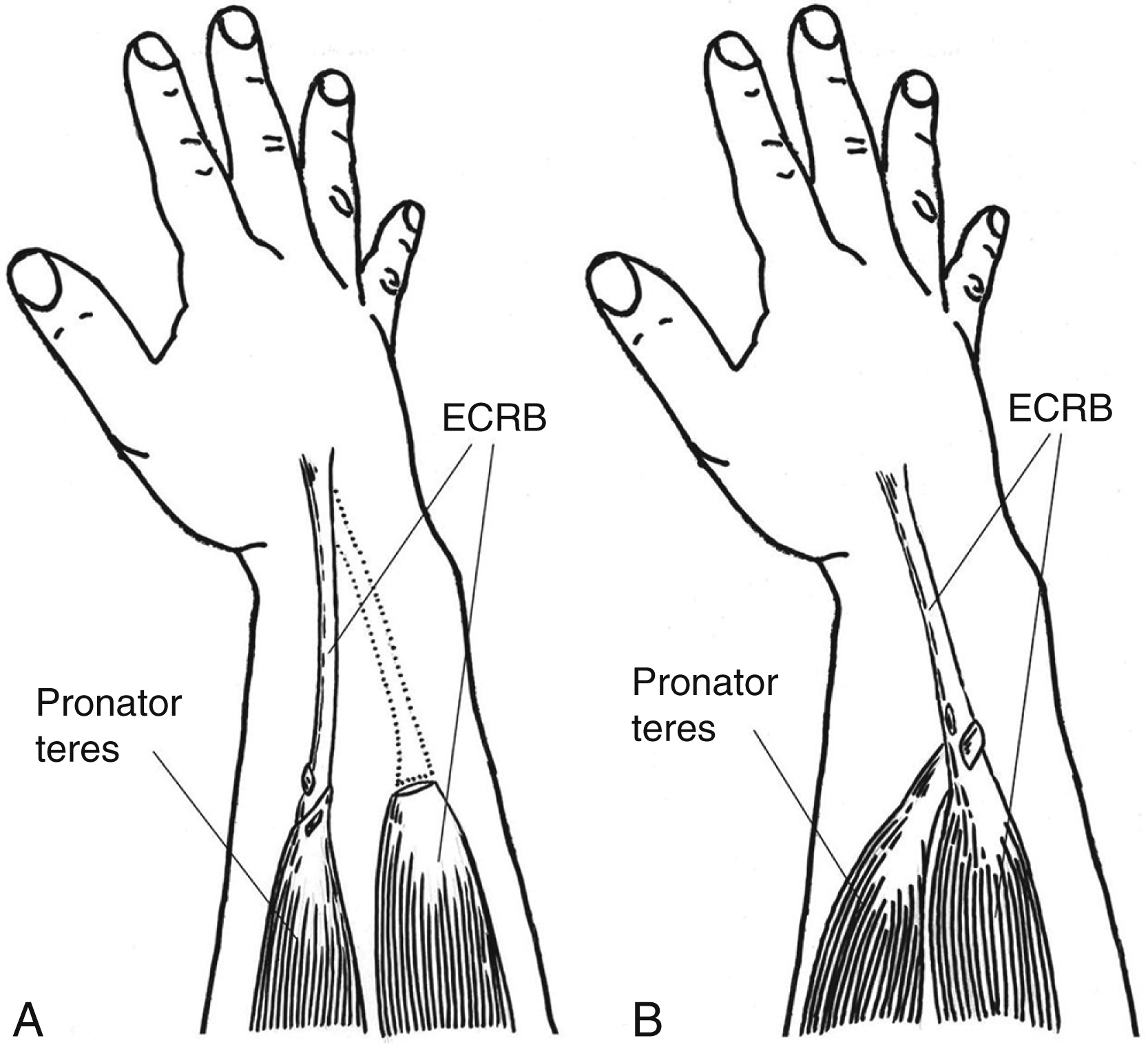 For reconstruction of wrist extension, the pronator teres (PT) to extensor carpi radialis brevis (ECRB) transfer is ideal ( Fig. 49.5 ), and other options are rarely considered. If radial nerve recovery is not anticipated, this should be performed end-to-end to achieve a more direct line of pull. If radial nerve recovery is anticipated, the transfer should be performed by an end-to-side technique, to allow ECRB to resume wrist extension once it regains function. PT should be released from its insertion with a strip of periosteum to provide a robust attachment. It is tunneled subcutaneously superficial to brachioradialis and ECRL, and inserted into the tendon of ECRB. If desired, ECRL may be synchronized to ECRB, with PT redirected to the new extensor complex.