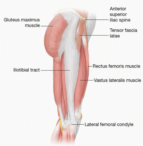 The tensor fascia lata (TFL) is a thin, bandlike muscle located in the lateral thigh just distal to the greater trochanter. It functions as a lateral knee stabilizer (FIG 1).