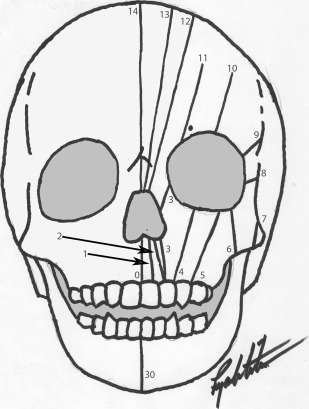 In 1976, Tessier proposed a classification system based on his personal experience with 336 patients, and the resultant ordered numbering system has greatly facilitated communication between reconstructive surgeons. Tessier’s system has gained widespread acceptance and is now the most consistently used method of describing craniofacial clefts in the literature. It is centered on the orbit, with clefts assigned a number in a counterclockwise rotation. Facial clefts are numbered from 0 to 7, with 0 a midline facial cleft, and the cranial clefts are numbered 8 to 14, with 14 being a midline cranial cleft. Midline mandibular cleft is assigned number 30 ( Fig. 1 ). Each of these clefts may involve both soft tissue and bone, and the number does not provide information regarding severity of tissue involvement, merely the location on the face and/or skull.