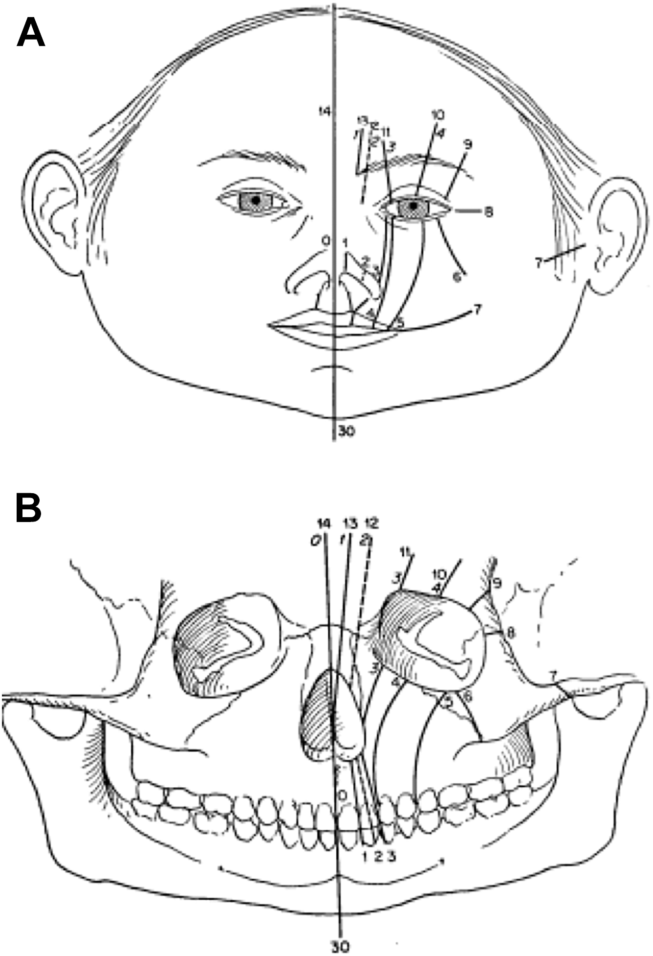 The landscape of craniofacial surgery, however, was revolutionized with the arrival of Paul Tessier. His meticulous anatomic studies and innovative surgical techniques marked a turning point for managing craniofacial anomalies. In 1976, Tessier introduced a comprehensive classification system, numbered 0 to 14 and 30, to categorize craniofacial clefts based on precise anatomic locations ( Fig. 1 ). The cleft is identified by the location of the skeletal defect, using the orbit as the primary reference structure. This framework provided a standardized approach to treatment, laying the foundation for modern craniofacial surgery. Consequently, craniofacial clefts, distinct from cleft lip or palate, are often referred to as “Tessier clefts.”