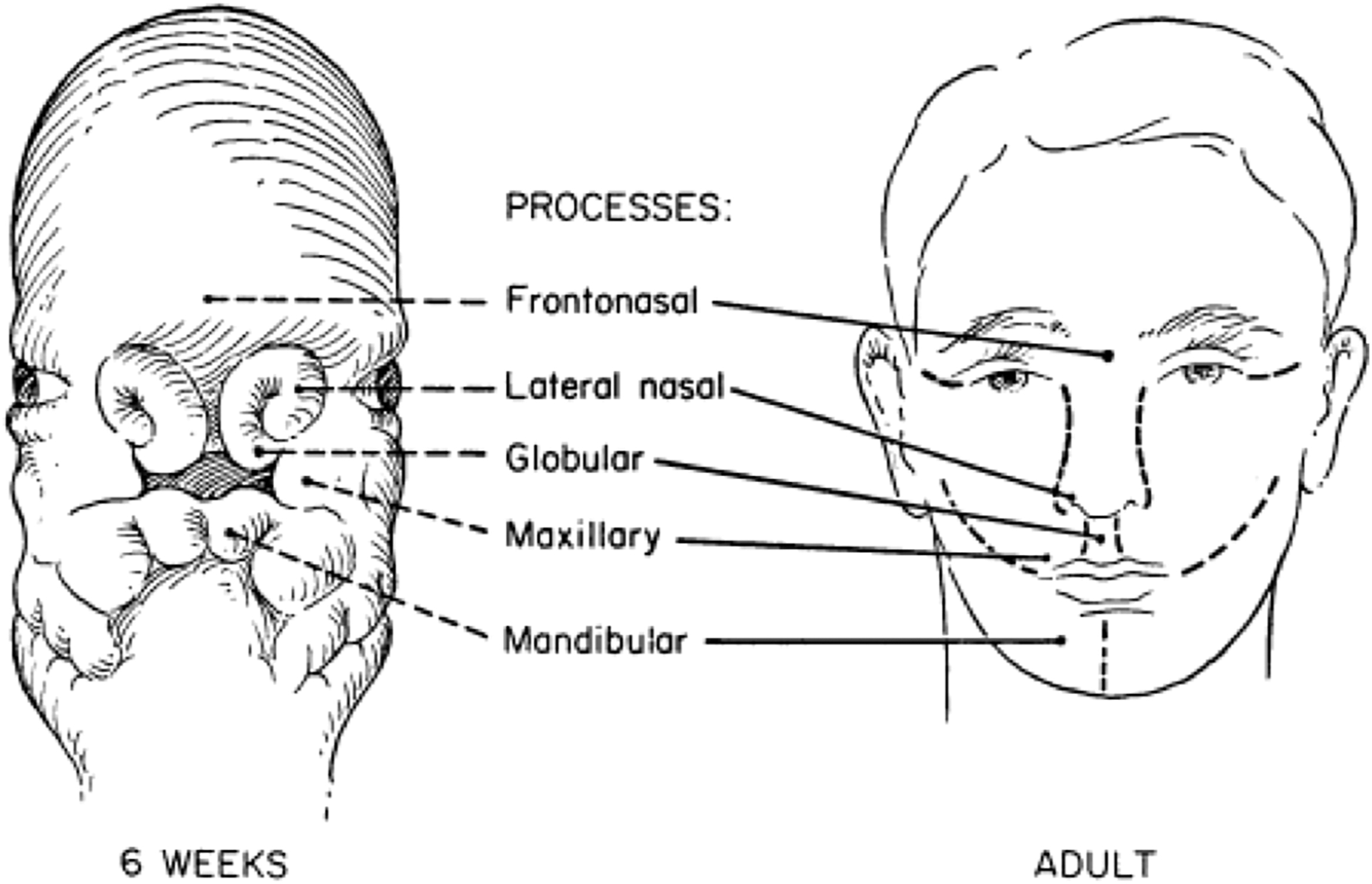 An understanding of embryologic events and the facial prominences is essential to this topic. Facial development of the fetus occurs between the third and eighth week of gestation via the convergence of 5 mesenchymal prominences along predictable embryonic lines: the frontonasal prominence, medial and lateral nasal processes, maxillary, and mandibular processes. , ( Fig. 2 ).