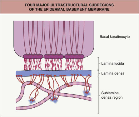 By transmission electron microscopy, the major ultrastructural subregions (from superior to inferior) of the epidermal basement membrane are: (1) the cytoskeleton, hemidesmosomal plaques, and plasma membranes of basal keratinocytes; (2) an electron-lucent region termed the lamina lucida; (3) the lamina densa; and (4) the sublamina densa region of the papillary dermis