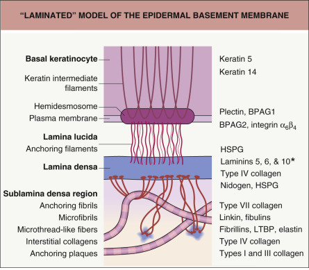 epidermal basement membrane, hemidesmosome, lamina lucida, anchoring filaments, lamina densa, anchoring fibrils, sublamina densa, integrin, laminin, collagen, epidermolysis bullosa, immunobullous diseases, salt-split skin
