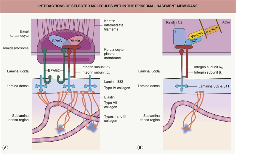 The epidermal basement membrane is comprised of proteins derived from keratinocytes of ectodermal origin as well as from dermal fibroblasts of mesodermal origin. Basal keratinocytes produce hemidesmosomal components such as plectin, the epidermal isoform of bullous pemphigoid antigen 1 (BPAG1e), bullous pemphigoid antigen 2 (BPAG2; collagen XVII), and integrin subunits α 6 and β 4 ; they also contribute CD151 tetraspan, types IV and VII collagen, laminins 332 (α3β3γ2) and 311 (α3β1γ1), and heparan sulfate proteoglycans to the epidermal basement membrane. Dermal fibroblasts produce nidogen, types IV and VII collagen, and other proteins that are translocated to the plasma membranes of basal keratinocytes where they condense and are incorporated within the basement membrane. Integrins and other proteins within the plasma membrane of basal keratinocytes are thought to provide key localization and organizational cues that facilitate the addition of these fibroblast-derived proteins to the basement membrane. The major proteins that comprise the various subregions of the epidermal basement membrane are described below ( Fig. 28.3 ).