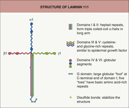Laminins are a family of heterotrimeric glycoproteins composed of at least 15 members . Laminins consist of three subunits (α, β, and γ) that are joined and stabilized by interchain disulfide bonds and other associations ( Fig. 28.4 ). Each laminin subunit is encoded by a different gene. To date, five α-, three β-, and three γ-subunits have been characterized . Of note, the laminin α3 subunit gene ( LAMA3 ) encodes two transcripts, α3A and α3B, corresponding to short and long variants, respectively.