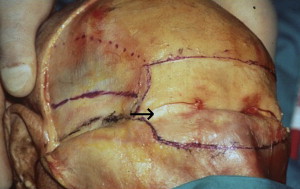 The skin of the forehead is thick and is densely adhered to the underlying subcutaneous tissue. Deep to the subcutaneous tissue is the previously mentioned galea aponeurosis containing the frontalis muscles anteriorly and the occipitalis muscle posteriorly. The galea is separated from the periosteum by loose connective tissue. The periosteum is contiguous laterally with temporalis muscle fascia at the temporal line. The periosteum of the forehead has a confluence with the orbital septum at the superior orbital rim. This dense fascia condensation is called the arcus marginalis ( Fig. 1 ). It is imperative that these decussating fibers be released for adequate and enduring brow-lift results.