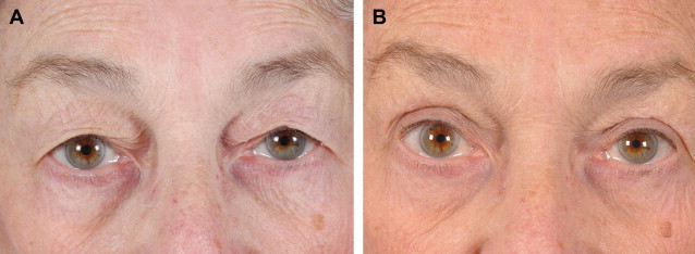 ( A ) Preoperative photograph of patient showing bilateral upper eyelid dermatochalasis and left upper eyelid ptosis. ( B ) Postoperative photograph of the same patient after bilateral upper eyelid blepharoplasty and left upper eyelid ptosis repair resulting in bilateral brow ptosis, left greater than right.