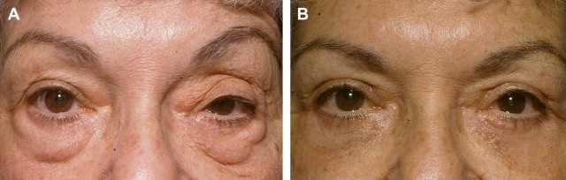 ( A ) Preoperative photograph of patient showing bilateral upper eyelid dermatochalasis. ( B ) Postoperative photograph of the same patient after blepharoplasty showing unmasking of brow ptosis left greater than the right.