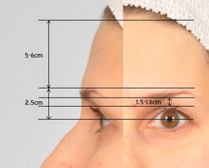 • Matarasso and Terino estimated the distance from the upper edge of the eyebrow to the hairline as 5 to 6 cm, the lower edge of the middle eyebrow to the eyelid crease as 1.6 cm, the lower edge of the eyebrow to the midpupil as 2.5 cm, and the lower edge of the middle eyebrow to the superior orbital rim as 1 cm.