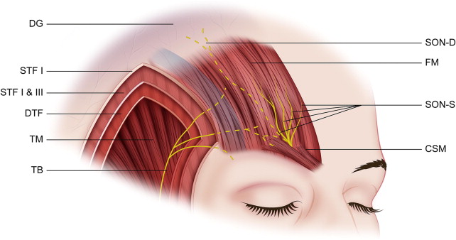 Fascial layers of the temporal region. CSM, corrugators supercilii muscle; DG, deep galea plane; DTF, Deep temporal fascia; FM, frontalis muscle; SON-D, deep division of the supraorbital nerve; SON-S, superficial division of the supraorbital nerve; STF I, outer layer of STF; STF II and STF III, deep STF layers; TB, temporal branch of frontal nerve; TM, temporalis muscle.