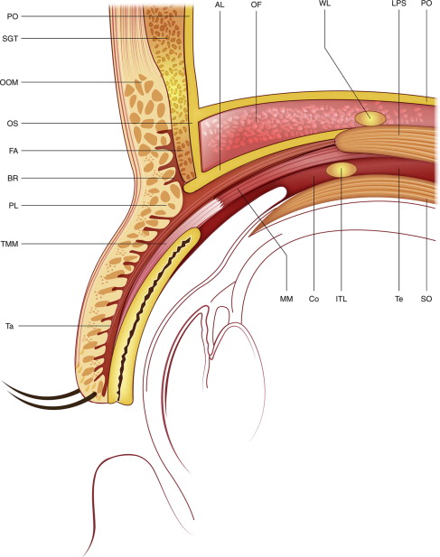 Surgical note: Although some investigators have advocated resection of the ROOF to improve the contour of the lateral eyelid, deformities related to resection can ensue and this can add to normal involutional eyebrow/eyelid deficits. Instead, vertical elevation of the ROOF via a brow lifting procedure is often necessary to achieve the desired contour of the brow-eyelid continuum.