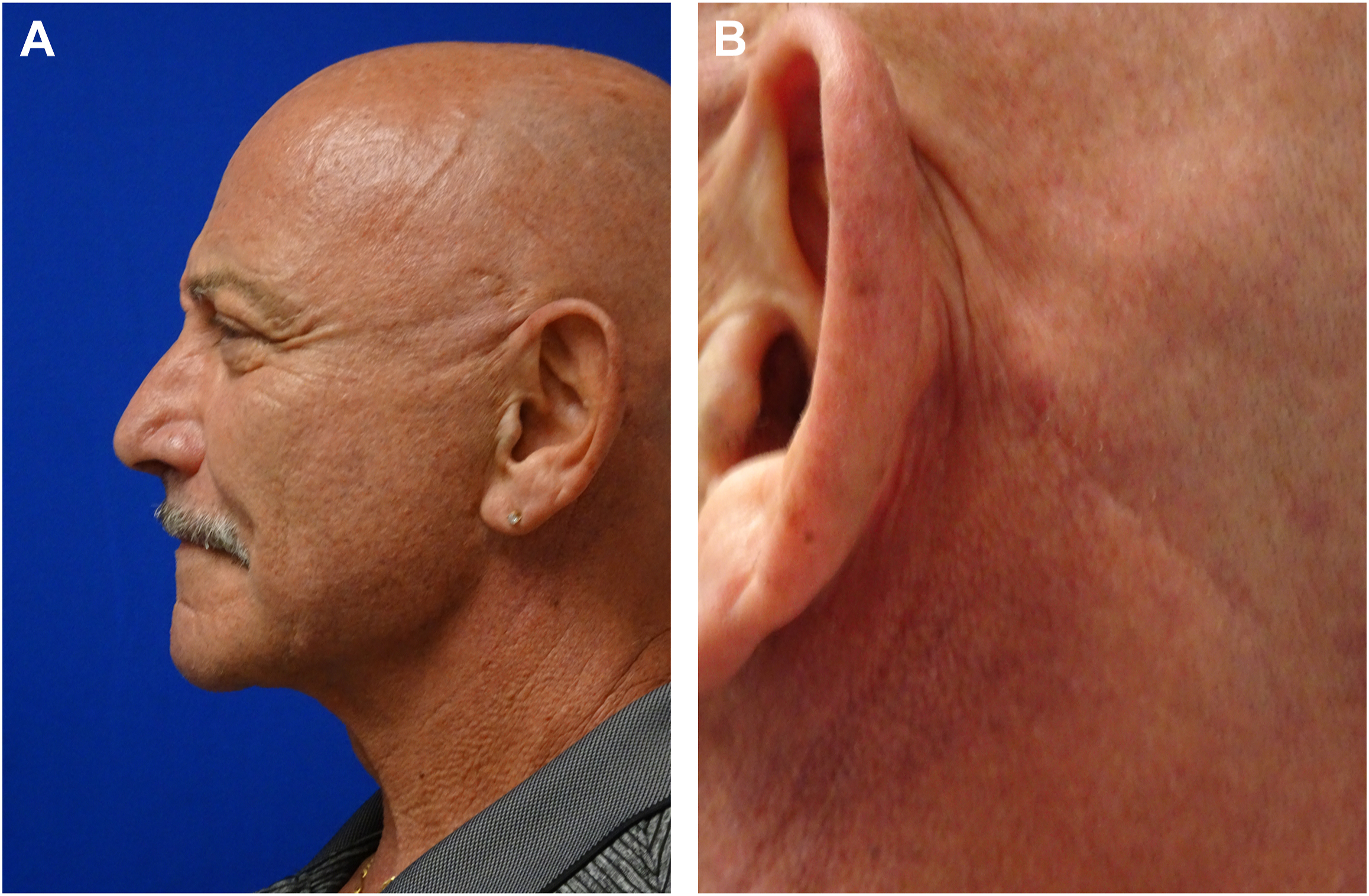 Many men have male pattern baldness, and some patients have alopecia and complete baldness, making scar camouflage more challenging [ ]. ( Fig. 1 ) A discussion about scar placement and scar visibility should be discussed with the patient in the surgical consult. Limiting skin tension on wounds, placing incisions in hidden creases around the ears and under the chin, as well as layered closure can be beneficial. Post-surgical scar modification may be necessary with laser skin resurfacing, 5-Flourouracil injections and silicone sheets, or gel. Keloid formers should be avoided, and hypertrophic scar formers should be identified pre-operatively and managed cautiously to achieve minimal scarring.