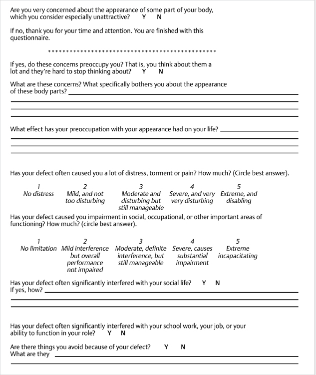 Fig. 16.1 The BDD Questionnaire-Dermatology Version (BDDQ-DV), which is considered positive if the patient acknowledges preoccupation with his/her appearance and has at least moderate distress or impairment in functioning.