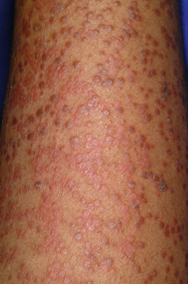 Lichenoid drug eruption. Note the flat-topped character of these small papules. This girl reacted to carbamazepine.