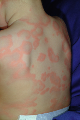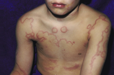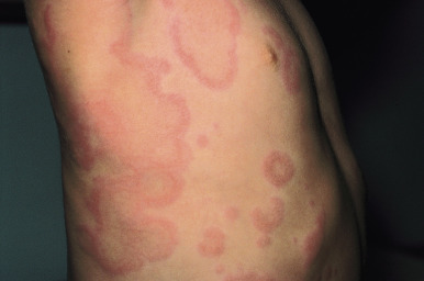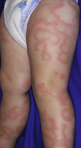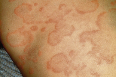 Typical lesions of urticaria have an edematous center with a halo of erythema ( Fig. 20-2 ). They vary from pinpoint-sized papules to large lesions several centimeters in diameter. Central clearing, peripheral extension, and coalescence of individual lesions result in a clinical picture of oval, annular, or sometimes bizarre serpiginous configurations ( Figs. 20-3 and 20-4 ). When annular or serpiginous patterns of urticaria occur, they can be confused with erythema multiforme (EM) or serum sickness reactions ( Fig. 20-5 ), and the designation urticaria multiforme has been proposed. Other mimics of urticaria include urticarial vasculitis, Henoch–Schönlein purpura, acute hemorrhagic edema of infancy (see Chapter 21 ), systemic onset juvenile idiopathic arthritis (see Chapter 22 ), and cryopyrin-associated periodic syndromes (see Chapter 25 ).