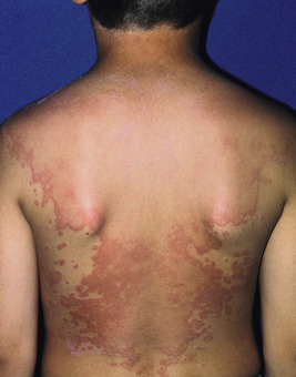 The hypersensitivity syndromes are a group of disorders mediated by immunologic or hypersensitivity reactions to foreign proteins such as food or drugs, or to infectious agents, immunizations, and malignancies. Although diagnosis of these disorders is often relatively easy, difficulties commonly arise in determining the underlying cause. The most common hypersensitivity reactions are drug reactions, and the skin is a common target. The overall incidence of drug reactions in hospitalized children is 9.5%, and in outpatient children it is 2.5%, with reactivity to antibiotics occurring most often. Urticarial and exanthematous reactions are seen most often. If fever, lymphadenopathy, or facial edema accompanies an exanthematous drug reaction, the possible diagnosis of a systemic hypersensitivity disorder (drug reaction with eosinophilia and systemic symptoms [DRESS]) must be considered. The various types of drug reactions are summarized in Table 20-1 . These include Stevens–Johnson syndrome (SJS), toxic epidermal necrolysis (TEN), lichenoid drug eruptions ( Fig. 20-1 ) (see Chapter 4 ), fixed drug eruptions, pustular eruptions (acute generalized exanthematous pustulosis [AGEP]), acneiform eruptions (see Chapter 8 ), pseudoporphyria (see Chapter 19 ), drug-induced vasculitis (see Chapter 21 ), and drug-induced lupus ( Chapter 22 ). Some children experience multiple antibiotic sensitivity, most commonly to penicillins, sulfonamides, cephalosporins, and macrolides. In these children, the manifestations of drug sensitivity can be different; for example a child may show an exanthematous response to amoxicillin, DRESS after phenytoin, and erythroderma after ingestion of sulfamethoxazole within a period of a few months. The general approach to a child with suspected drug reaction is outlined in Box 20-1 .