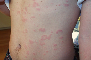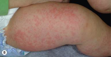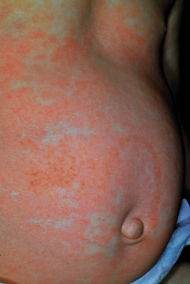 Urticaria. Transient round and annular erythematous macules and slightly edematous plaques represent a reaction to cefdinir in this infant.