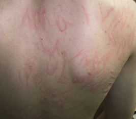 Dermographism. Sharply localized edematous reaction with a surrounding zone of erythema that occurs precisely at the site and within seconds of firm stroking of the skin.