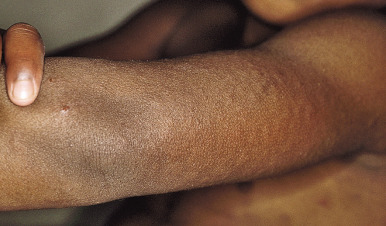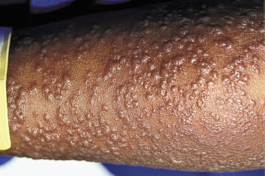 Aquagenic urticaria , a disorder that resembles cholinergic urticaria, occurs most often in adolescence and is characterized by small, intensely pruritic, perifollicular papular wheals with surrounding erythema ( Fig. 20-11 ). The palms and soles are spared. The disorder is precipitated by contact with water or perspiration (irrespective of temperature). Exercise and other cholinergic factors do not precipitate this disorder. Patients can drink water without adverse reaction. Antihistamines often improve reactivity, but do not totally suppress it.