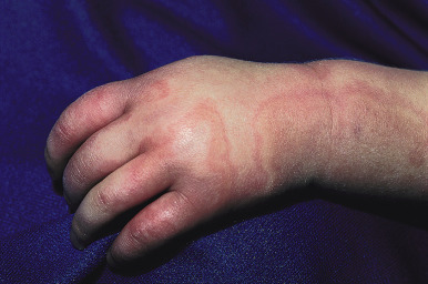 Urticaria may be localized to one small area or may become generalized ( Fig. 20-6 ). Subcutaneous extension may result in giant wheals. In infants and young children, swelling of the distal extremities with acrocyanosis may be a prominent feature of the urticarial reaction. Occasionally, particularly in infants and young children, bullae may form in the center of the wheal, usually on the legs and buttocks. Individual wheals rarely persist longer than 12 to 24 hours. Parents can draw a circle around a few lesions to verify clearance of each individual lesion by approximately 24 hours or less. Those lasting longer than 24 to 36 hours are probably not true urticaria and may represent another vascular pattern such as urticarial vasculitis (see Chapter 21 ) or EM.