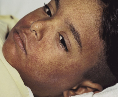 Drug reaction with eosinophilia and systemic symptoms (DRESS). Three weeks after initiation of carbamazepine, this boy developed facial edema with dusky erythematous papules. The pruritic eruption subsequently spread caudally. Hepatic transaminase levels were noted to be significantly increased.