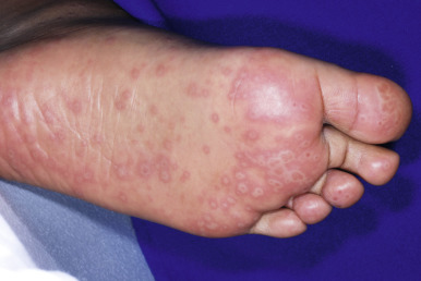 Stevens–Johnson syndrome. Note the bullae on the sole in this girl who reacted to lamotrigine.
