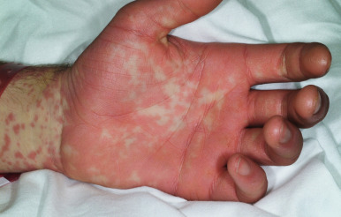 Stevens–Johnson syndrome (SJS). Intensely erythematous macules are nearly confluent the palms of this boy with SJS from carbamazepine.