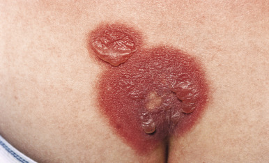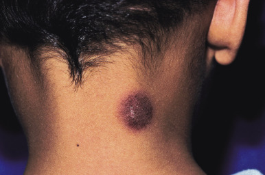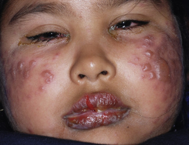 Lesions are solitary at first, but with repeated attacks, new lesions usually appear and existing lesions may tend to increase in size to more than 10 cm in diameter. Not uncommonly, lesions recur at the same site(s). The lesions tend to be erythematous, edematous, and dusky at their onset with well-defined borders. At times they may become bullous ( Fig. 20-29 ), with subsequent desquamation or crusting and a residual hyperpigmentation that may persist for months ( Fig. 20-30 ). Lesions can occur anywhere on the body but have a predilection for the perioral area, lips, hands, trunk, and genital region. In a series of affected boys with genital involvement, the clinical presentation usually consisted of swelling and erythema of the penis and/or scrotum associated with pruritus or burning, restlessness, urinary retention, and painful micturition.