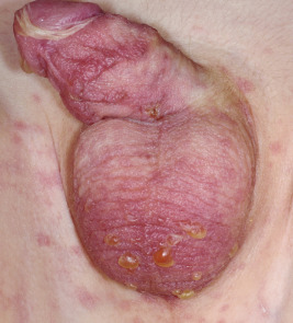 Toxic epidermal necrolysis. Note the discrete bullae on the scrotum sloughing of mucosae at the glans. The sloughed skin resembles wrinkled, wet, tissue paper.