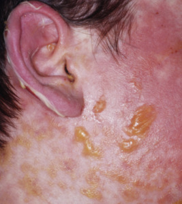 Toxic epidermal necrolysis (TEN). Note the sloughing of skin on the ear, which is exacerbated by gentle stroking of the area (positive Nikolsky sign). The mucosal involvement in this boy originally was typical of Stevens–Johnson syndrome, but he progressed to the extensive denudement of TEN.